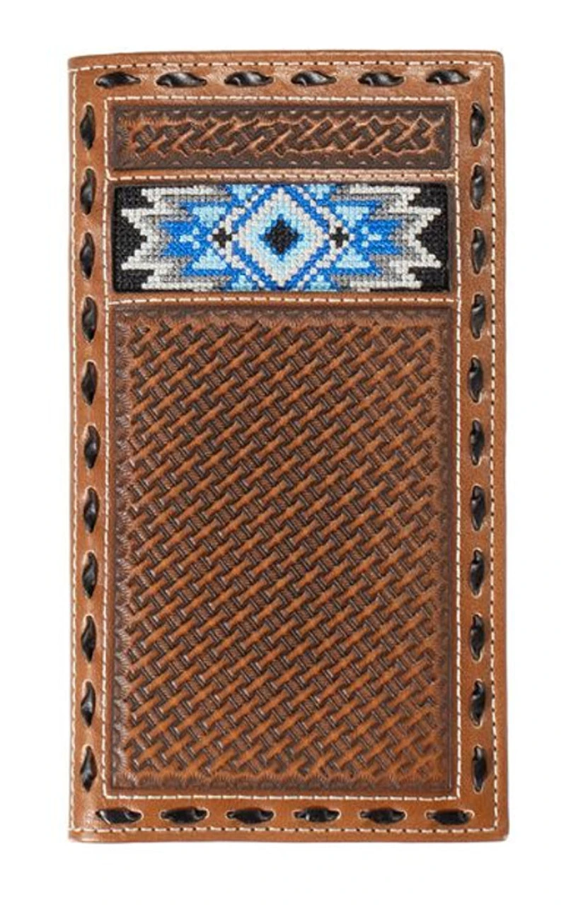 Decorative and stylish mens 3D rodeo wallet. It is made of genuine brown leather. Basket weave and sunburst embossing accented with a blue diamond embroidered inlay. The edges are trimmed with a buck lace stitching. Slim fit design and heavy duty stitching for durability. Multiple card slots along with an ID window. 3D Wallet Rodeo Style Brown 100% Leather Basket Weave and Sunburst Embossing Blue Diamond Embroidered Inlay Slim Fit Design Heavy Duty Stitching Multiple Card Slots ID Window