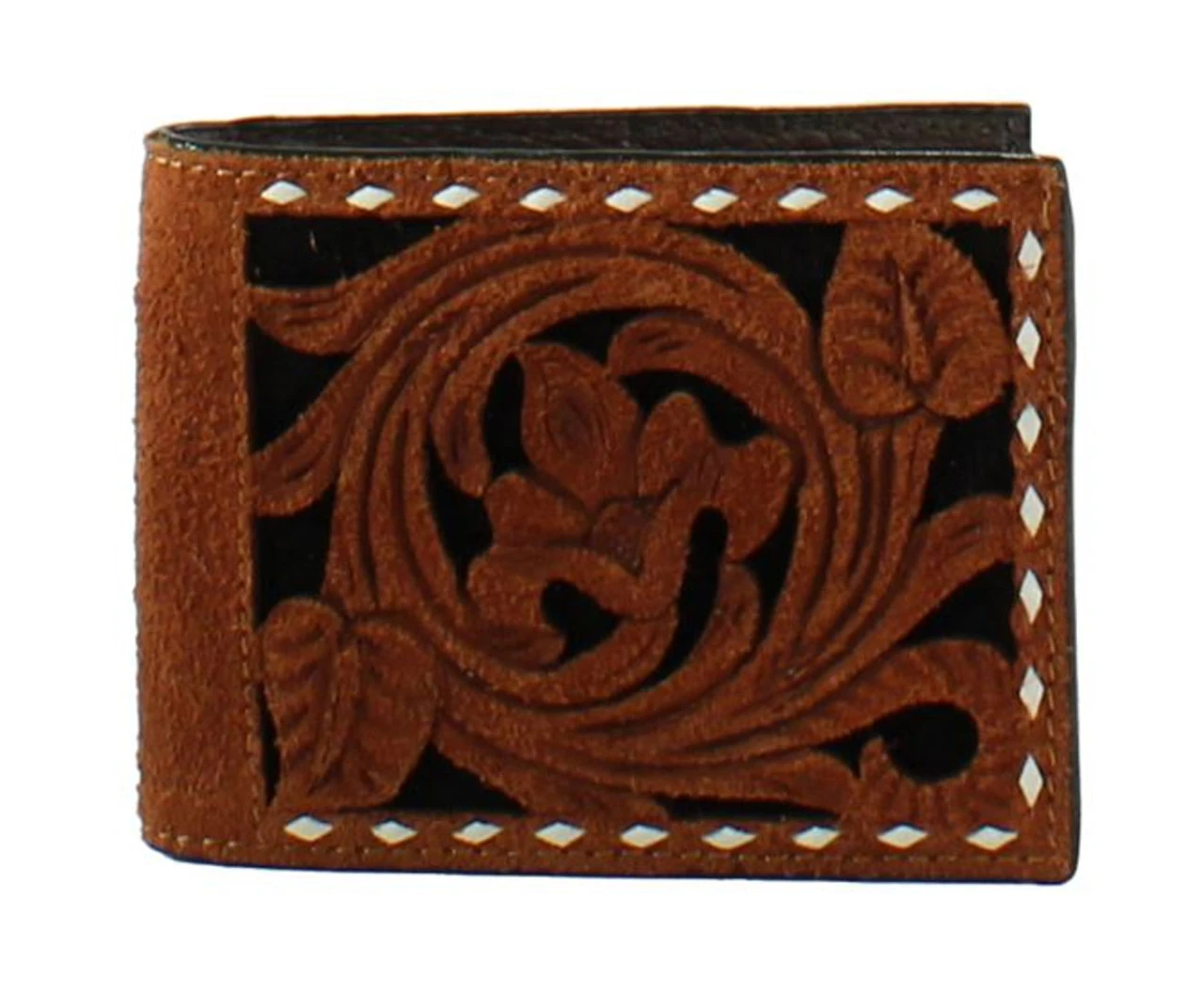 : Decorative and stylish menâs 3D rodeo bifold wallet. Roughout floral filagree on top with a black inlay. The outer border is accented with a white buck lace stitching and the back of the wallet is dark brown. Multiple slots for cards and a clear ID pocket. 3D Rodeo Bifold Wallet Brown with Floral Filagree Black Inlay 12 Card Slots Clear ID Pocket