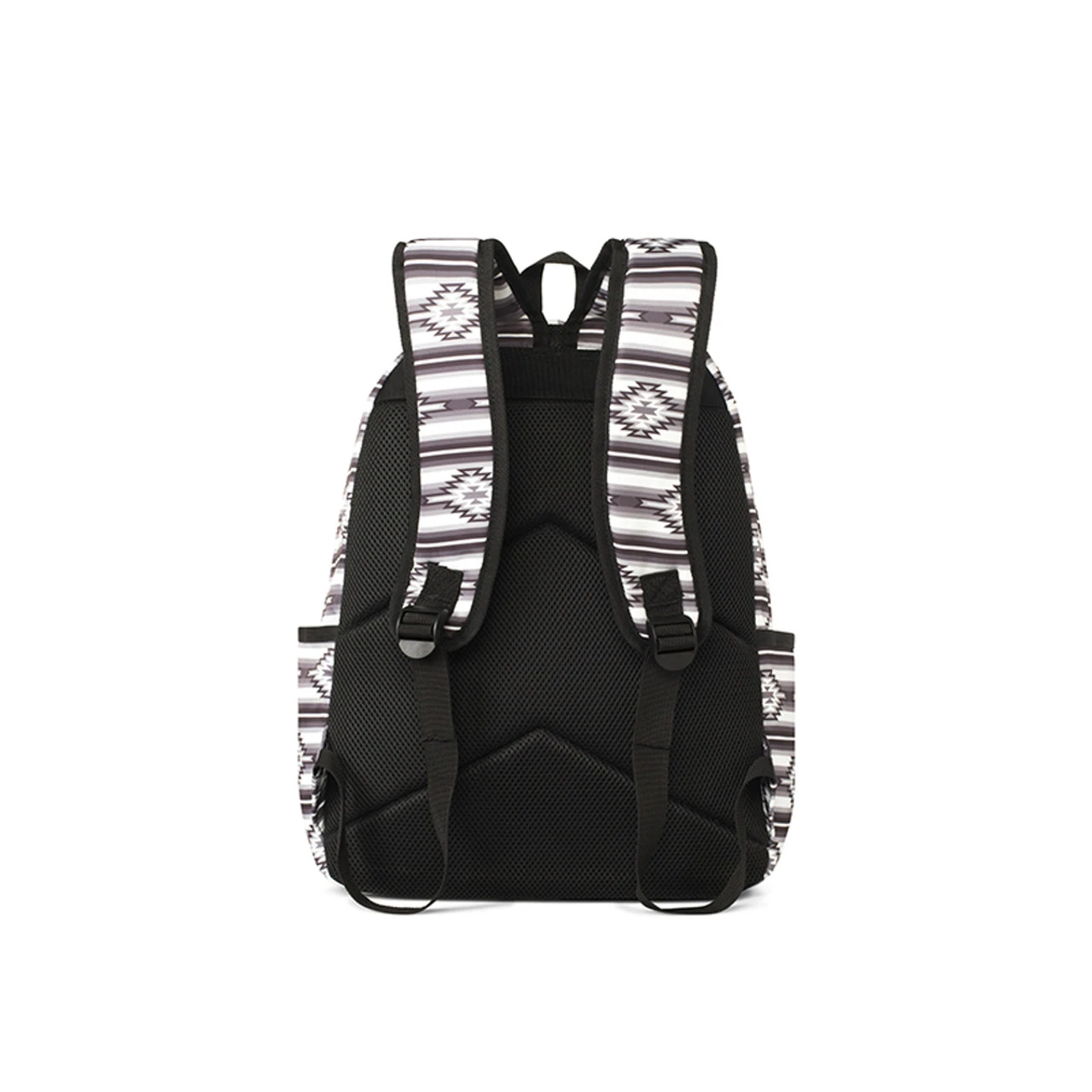 This durable Ariat backpack is a must have for anyone who has a lot to carry. One compartment that has space for a laptop on the inside, and a zipper compartment. One small zipper compartment on the front of the backpack and a drink holder on the side. Grey and white Aztec pattern covering the front of the backpack and the back is black. Adjustable straps. Ariat Backpack Black and White Striped Aztec Print Zipper Compartment Inside Back is Black Ariat Signature Logo Adjustable Straps Measures: 16 x 12
