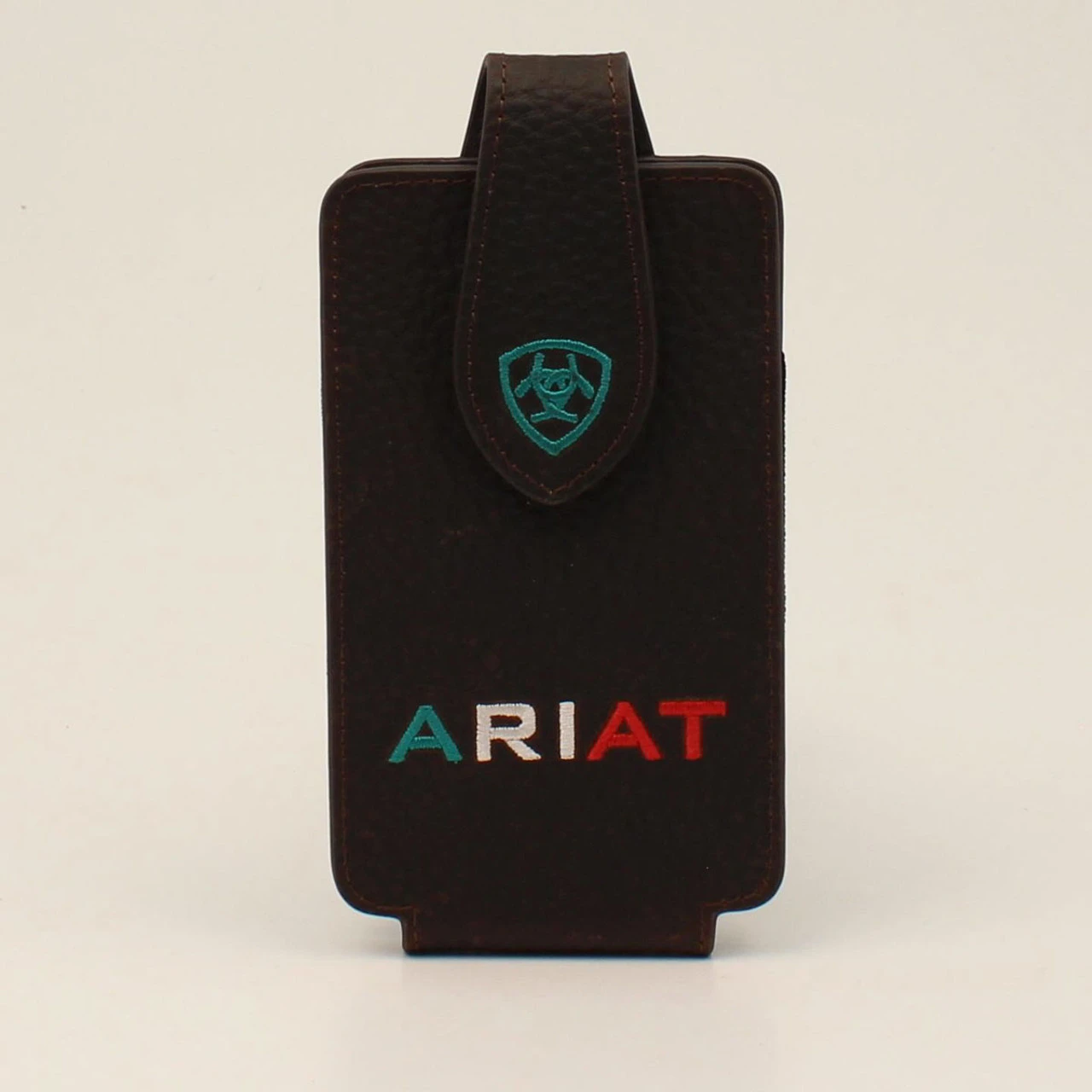 Ariat cell phone case by M&F Western Products in genuine rowdy brown leather. Stitched Ariat logo and shield in colors of the Mexico flag. Magnetic closure on tab and plastic swivel clip on back.