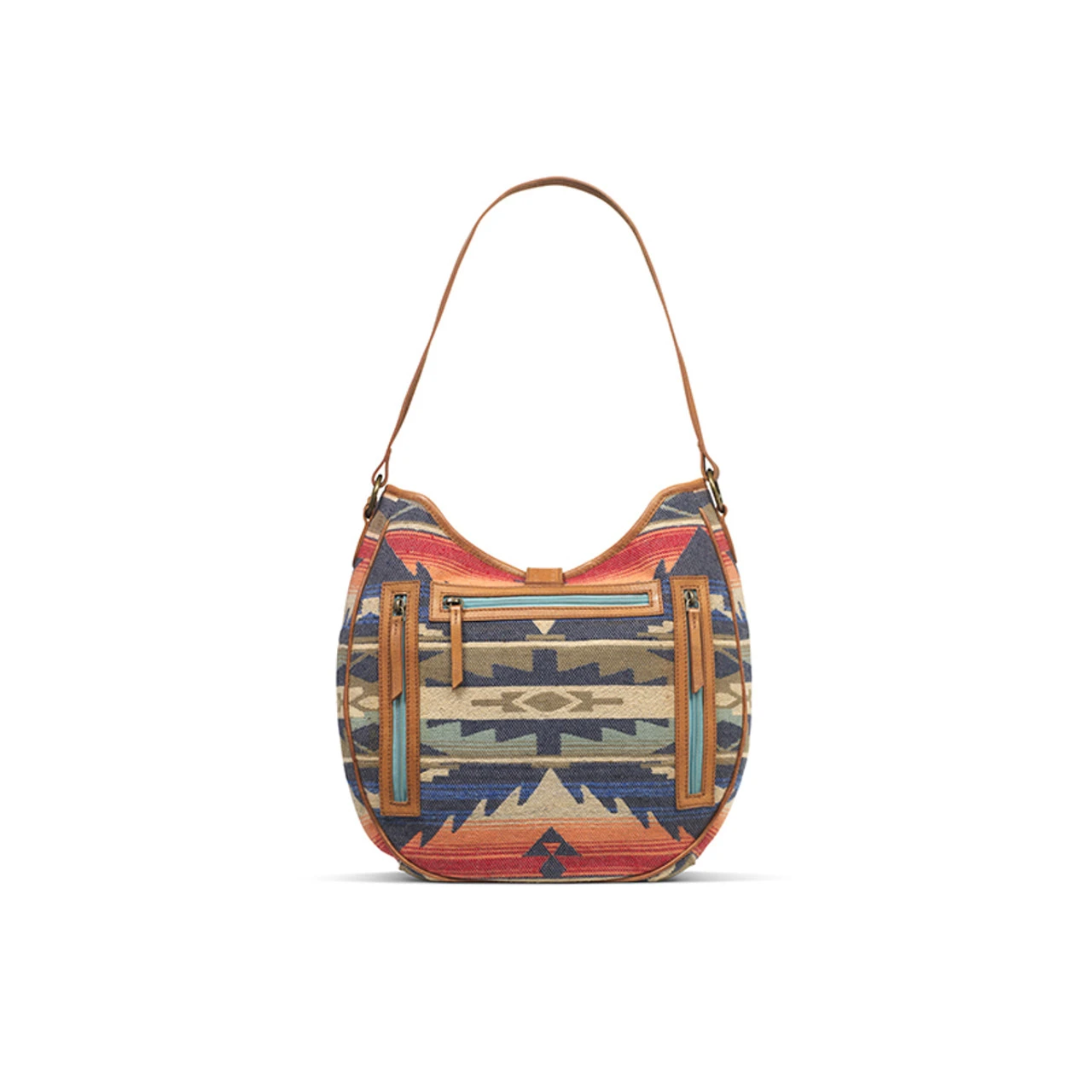 Ariat ladies conceal carry hobo bag from the Wynonna collection. The body of the bag is covered in a colorful southwestern pattern. Top of the bag securely closes with a zipper and a leather strap that buttons. Ariat Conceal Carry Hobo Bag Multi Colored Southwestern Pattern Wynonna Style Zipper Closure Adjustable Strap 25% Leather, 65% Jacquard, 10% Suede Measures: 14 x 14 x 4-1/2