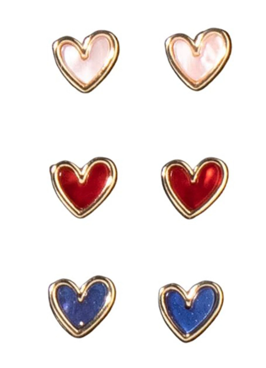 Blazin Roxx ladies earrings by M&F Western Products. 3 sets of heart shaped earrings. One pink, red and blue with a gold border. Blazin Roxx Ladies Earrings Multi Colored 55% Zinc, 45% Acetate Heart Shaped Post Style Set of 3