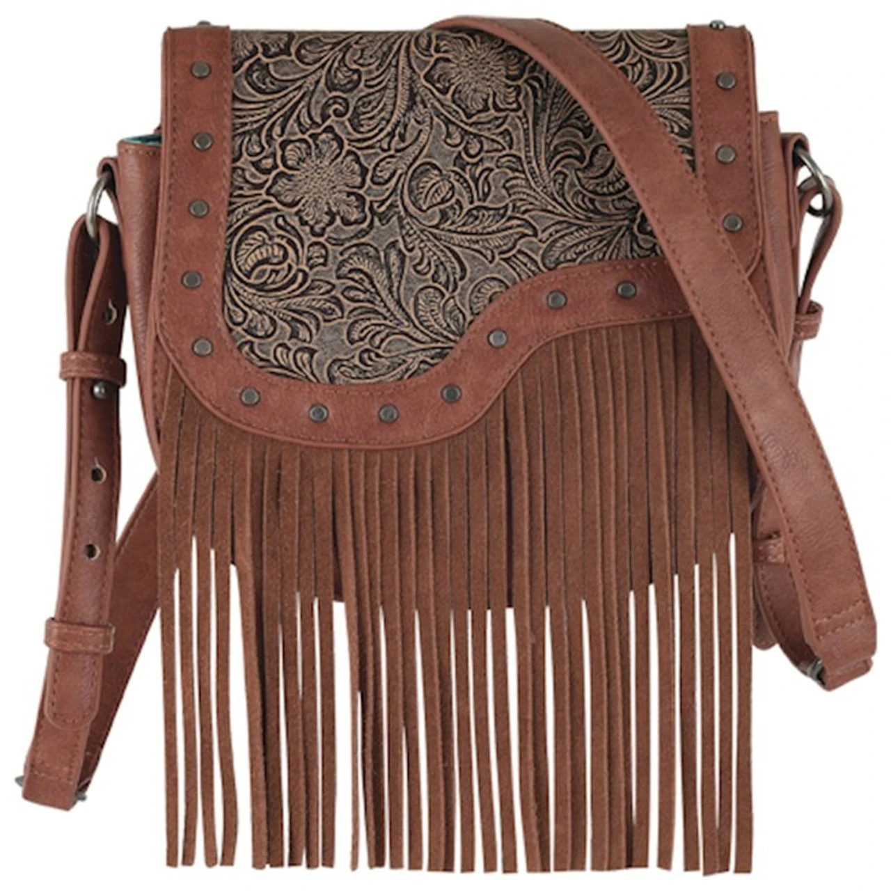 Ariat Brown Trifold Wallet With Metal Stud Trim And Basket Weave Sunburst Embossing
