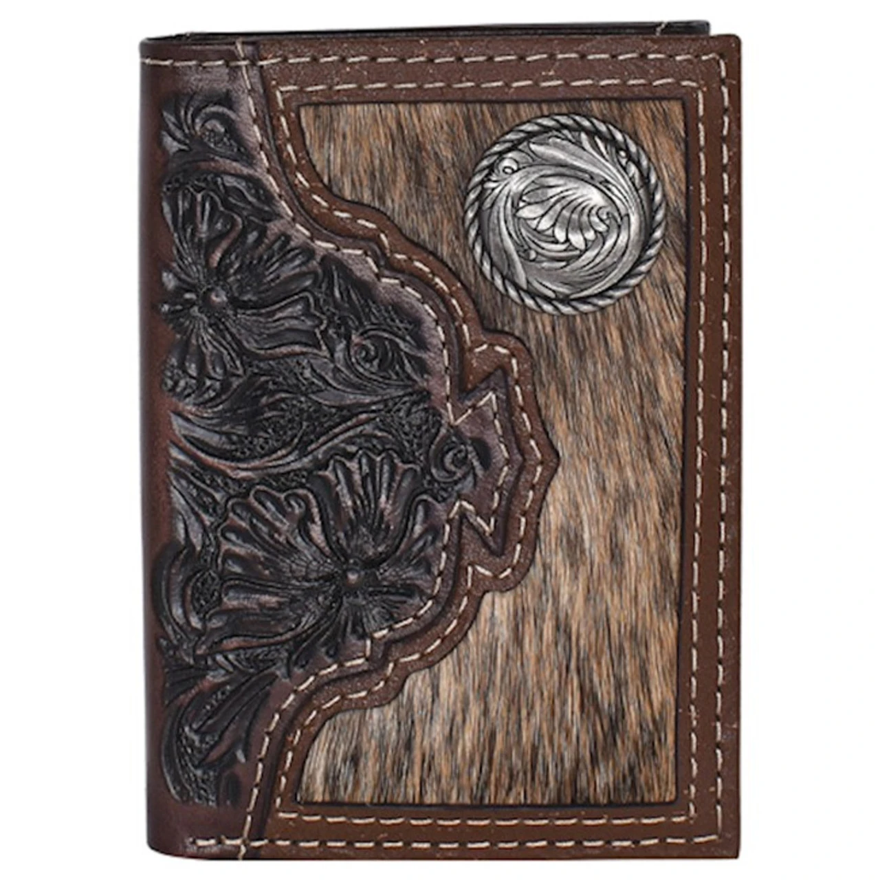 JUSTIN MENS GENUINE LEATHER TRIFOLD WALLET BRINDLE HAIR ON LEATHER WITH TOOLED YOKE AND CONCHO 9 CREDIT CARD SLOTS 1 ACCESSIBLE ID WINDOW 1 SLIP POCKET