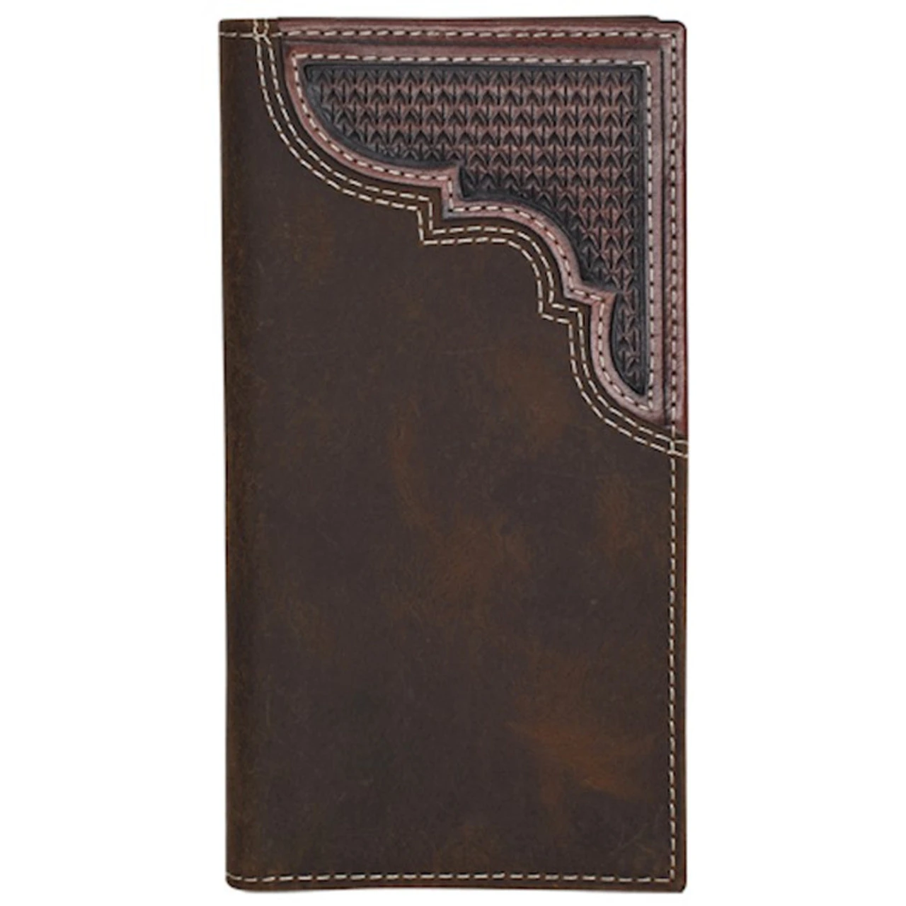 JUSTIN MENS GENUINE LEATHER RODEO WALLET EMBOSSED YOKE OVER OILED LEATHER 1 ACCESSIBLE ID WINDOW 1 EXTERIOR SLIP POCKET 5 CREDIT CARD SLOTS 5 SLIP POCKETS