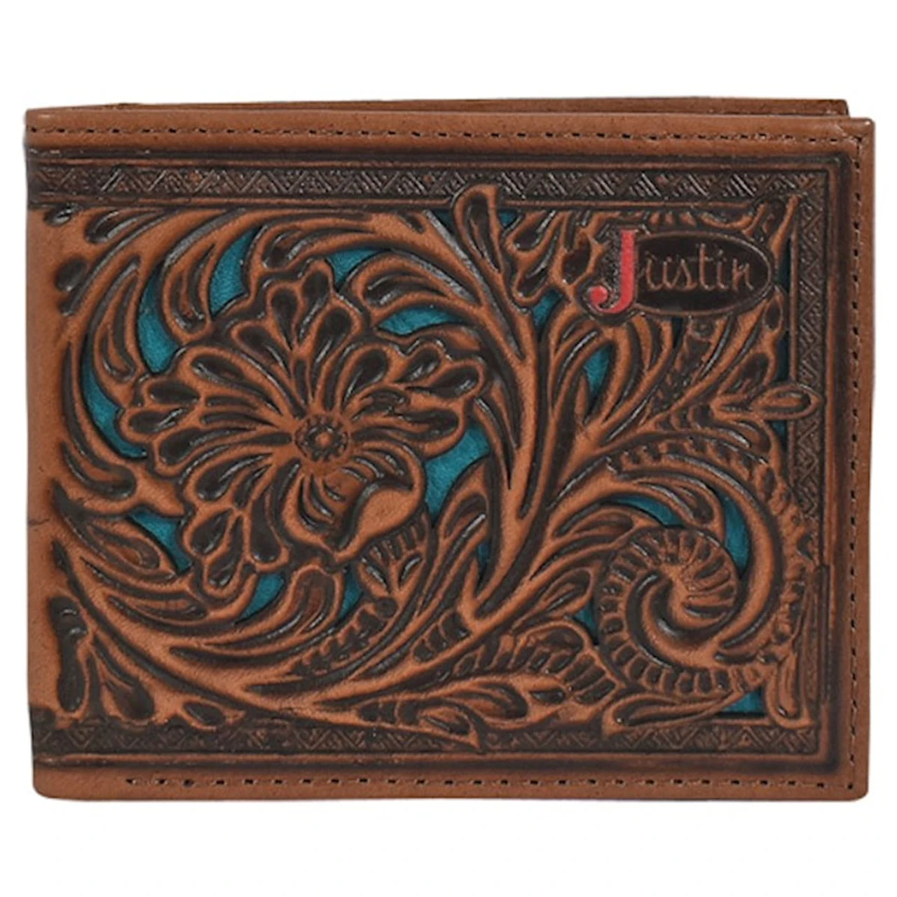 Justin Mens Genuine Leather Slim Bi-Fold Wallet Tooled Pattern with Turquoise Underlay 4 Credit Card Slots 2 Slip Pockets 1 Currency Pocket