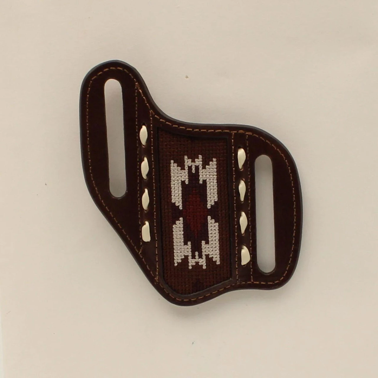 You will always have your knife with you when you use this Nocona knife sheath by M&F Western Products. Made of genuine leather with a southwestern pattern fabric inlay. Contrast buck lacing. Designed for pocket knives.