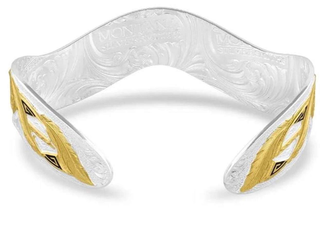 A boundless design that celebrates the legacy of Montana Silversmiths. The two-tone Boundless Montana Legacy Cuff Bracelet features a stunning Southwest design with black paint accents that give drama and depth to the design. The shape of the cuff has a unique flow that provides interest and movement to the piece. Let this stunning bracelet shine with any outfit to create an elegant yet approachable look. One size fits most.