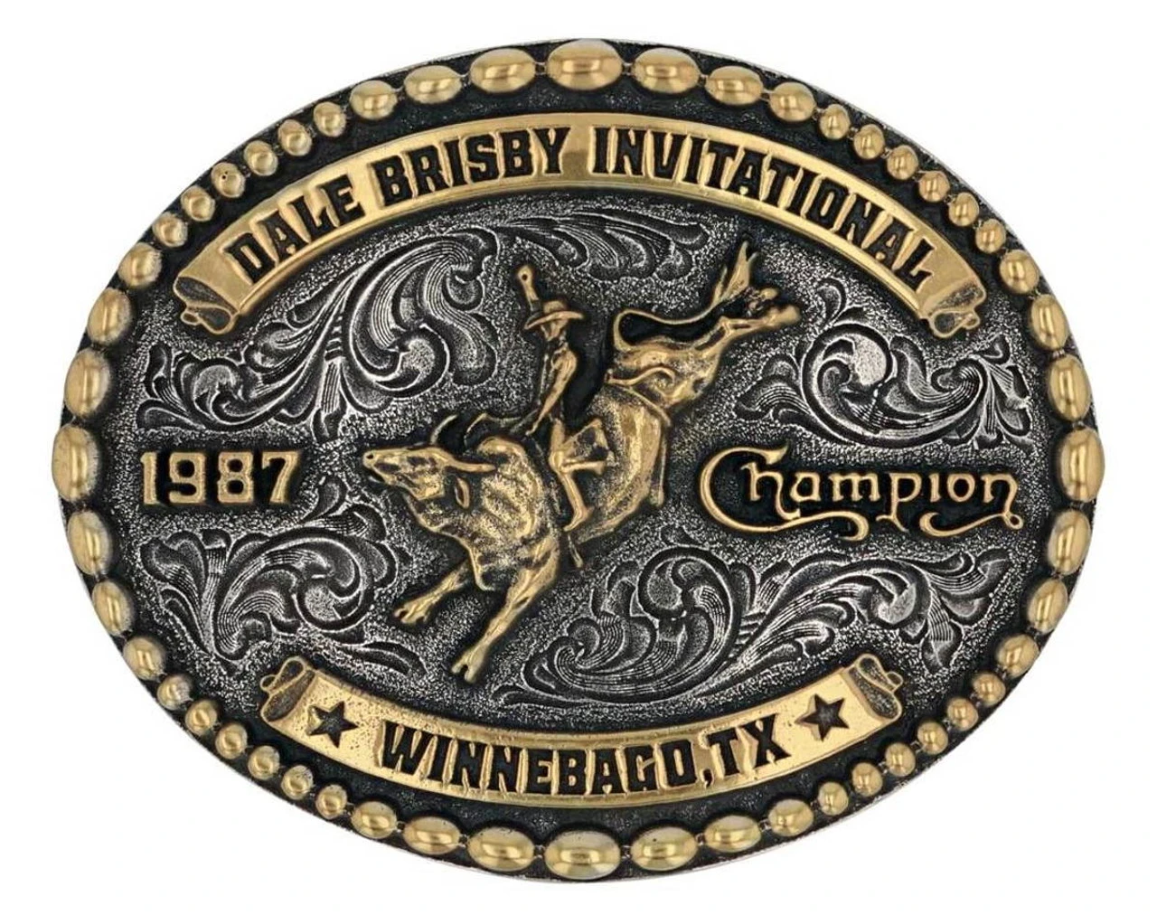 Although Dale Brisby is a new and edgy cowboy, a lot about him is classic country. As is this belt buckle in his collection! Our Dale Brisby Invitational Attitude Belt Buckle is oval shaped with an antique-silver tone. It has a gold-tone studded trim with “Dale Brisby Invitational. Winnebago, TX 1987 Champion” in the center with a bull riding figure. Standard 1.5″ belt swivel.