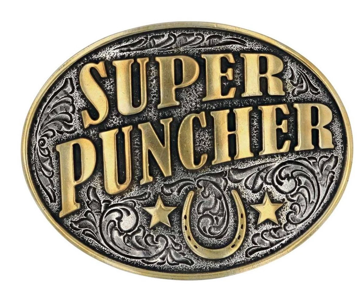 Name two words that are Dale Brisby’s favorite? Easy: “Super Puncher!” This Dale Brisby Collection Belt Buckle is silver-toned with phenomenal faint filigree etching. It holds the words “Super Puncher” in the center in a gold-tone. This buckle has a standard 1.5″ belt swivel and a smooth gold-tone trim.