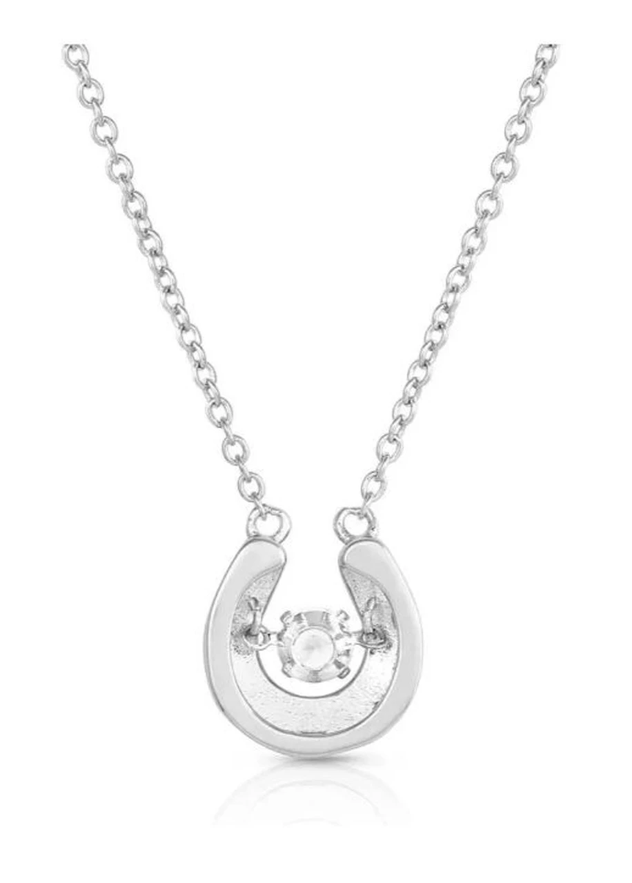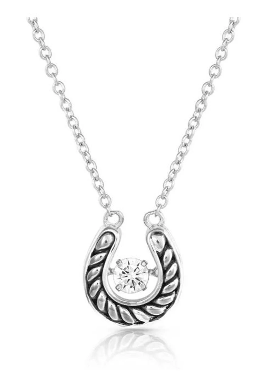 The only thing better than a little luck is Dancing With Luck. The silver tone horseshoe pendant is detailed with intricate roping. In the center is a clear cubic zirconia crystal that dances with every movement. Show off your moves with this beautiful necklace secured by an 18 inch silver tone chain perfect for dancing the night away.