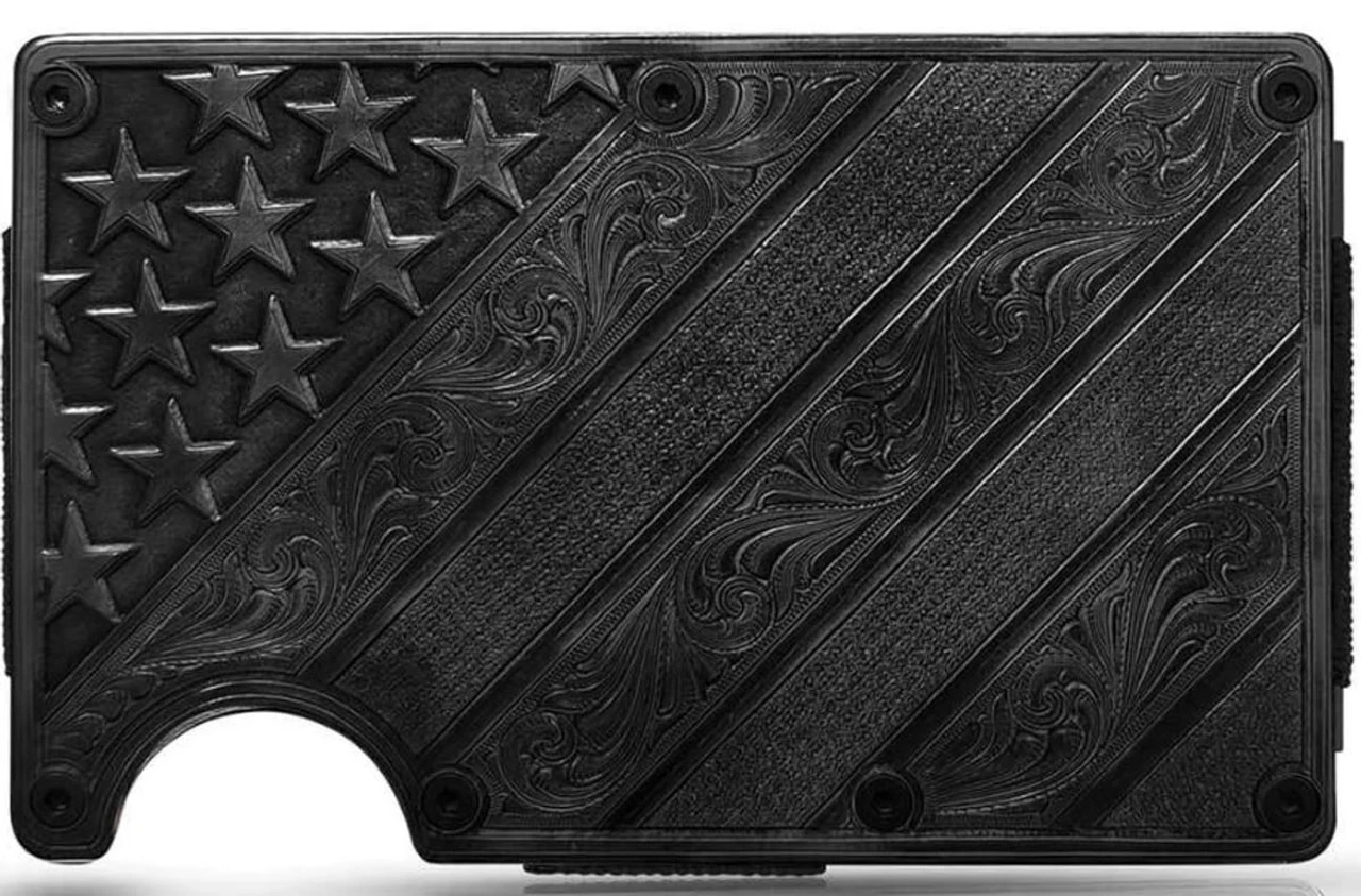 Like the dark night before the sunrise this credit card and cash case features a dark gunmetal finish. The front of the case holds the American flag with etched stars and stripes in the dark finish. Keeping close to our roots some of the stripes hold filigree to represent western heritage. The center holder expands to accommodate a multitude of cards with a secure elastic. The opposite side features a clip to hold your cash.