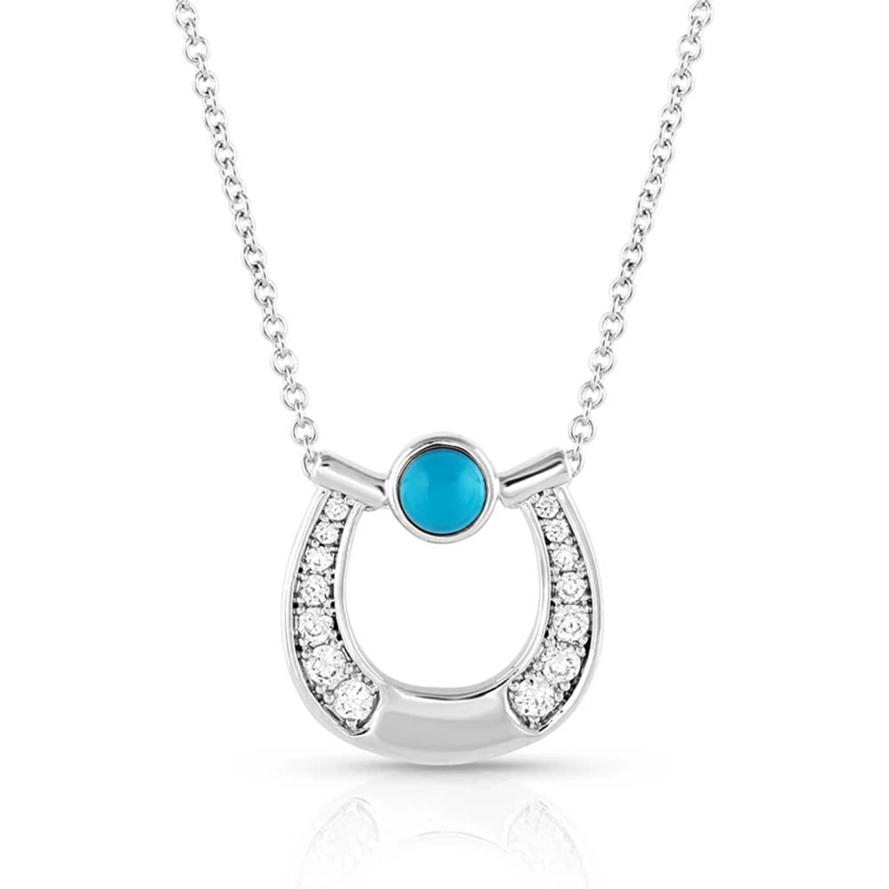 Materials: Rhodium over brass. Cubic Zirconia. Synthetic Turquoise. Rhodium over brass chain.