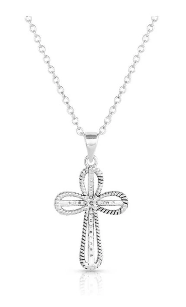 A lovely way to show your beliefs, our Expressive Faith Crystal Cross Necklace is made of a gorgeous silver-tone with western-style roping and sparkling clear cubic zirconia crystals. The clear cubic zirconia crystals create the center cross and silver tone twisted rope creates a larger cross around the center. Their graceful shape and elegant design make them right for any occasion from the trail or pasture to Sunday morning worship. Simply styled this 19 inch silver tone necklace can be worn to share your faith everywhere you go.