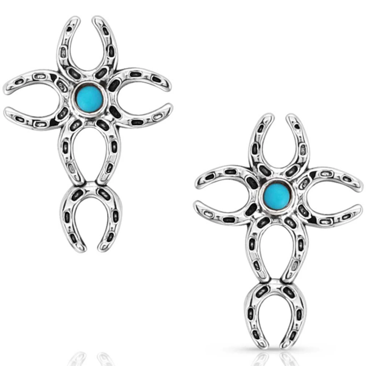 Materials: Rhodium over brass. Synthetic turquoise. Paint. Stainless steel post back wire.
