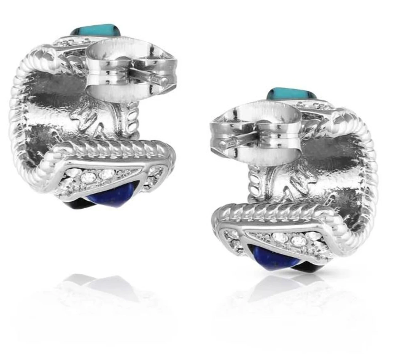 Rhodium over brass. Synthetic turquoise. Blue Lapis. Black glass. Synthetic mother of pearl. Cubic zirconia. Stainless steel post back wire.