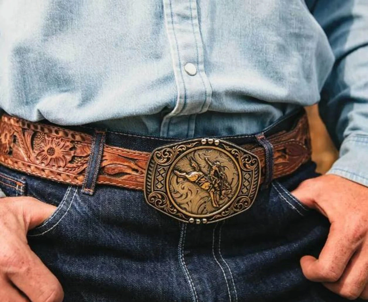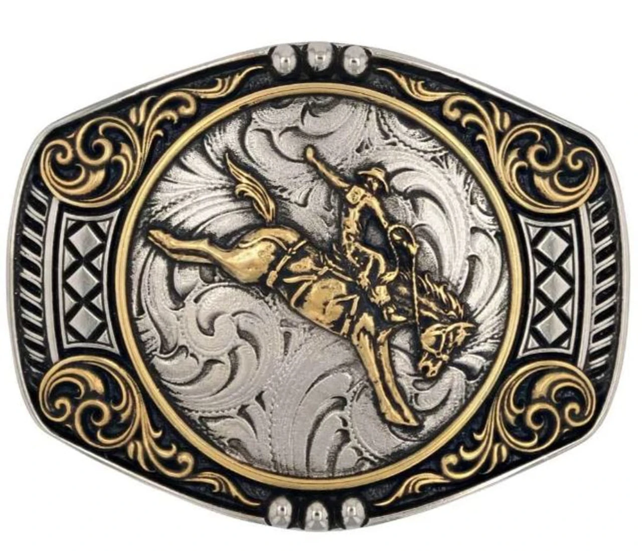 This handsome belt buckle boasts a horse and cowboy riding out the storm Western style. The Ride the Storm Attitude Buckle is crafted with rounded edges in gold and silver tones. The buckle is detailed with filigree and flourishes surrounding the central figures for eye-catching interest. Standard 1.5 inch swivel.