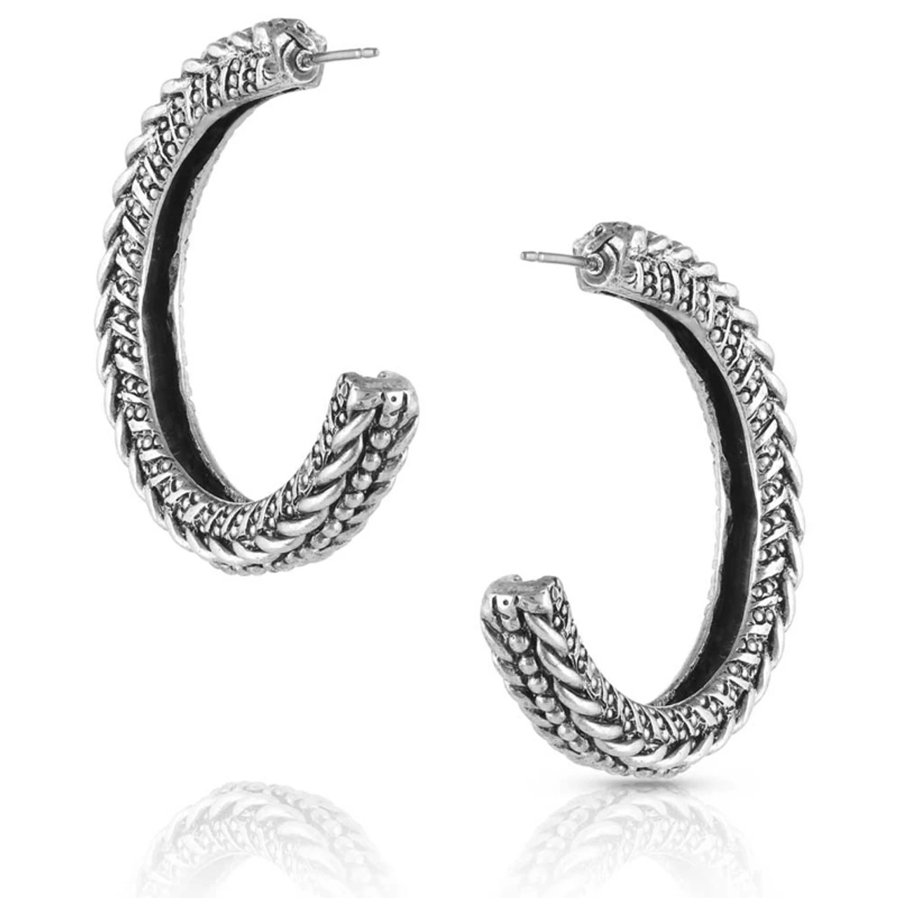 The Roped in Hoop Earrings are a stylish and unique accessory that will add a touch of texture to your look. The earrings feature a silver tone hoop with intricate rope detailing, giving the earrings a western feel. The hoop design is secured by a hypoallergenic post back wire. The earrings are classic and timeless, as well as versatile and easy to pair with a variety of outfits.
