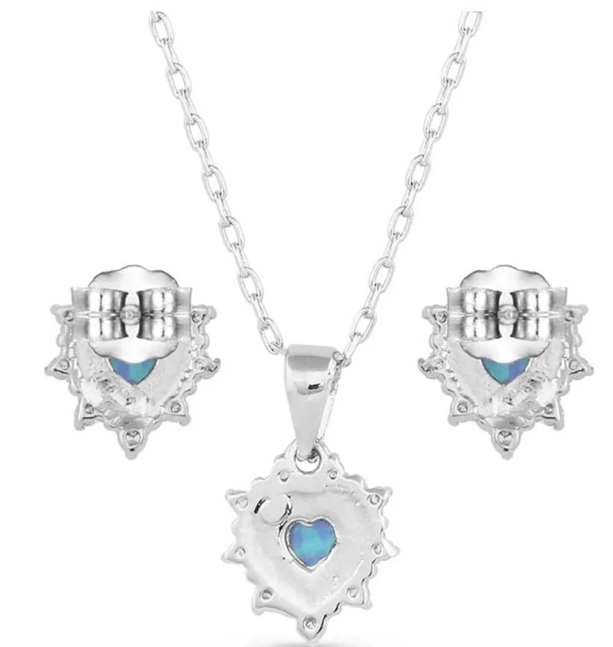 The Royal Heart Opal Jewelry set consists of a matching necklace and earrings. The necklace in the jewelry set is an elegant heart-shaped blue opal stone. Radiating outward from the opal heart are small clear cubic zirconia stones. The necklace hangs from a 19 inch silver tone chain. The matching post earrings are attached by a hypoallergenic post-back wire.