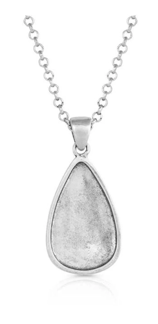 Turquoise necklace with western flair are always appropriate. This pretty necklace, designed in a gleaming silver tone, has a beautifully etched frame at the center of which sits a large teardrop-shaped turquoise bead. Perfect for work or play this lovely necklace is finished with an 18 inch silver tone chain and a chic way to lend western style to any outfit.