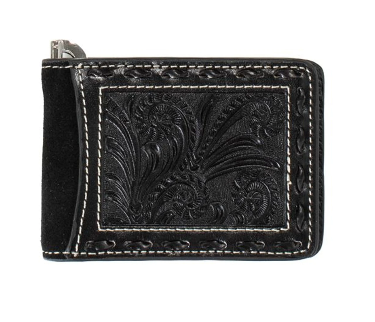 This Nocona bifold money clip by M&F Western Products is genuine leather. Roughout leather on edges, with black buck lace stitching down the sides and a floral embossed tab. Card slots and ID window. Nocona Mens Wallet Money Clip Style Genuine Leather Floral Embossed Tab Black Buck Lace Stitching Slim Fit Design Heavy Duty Stitching Multiple Card Slots ID Window Black