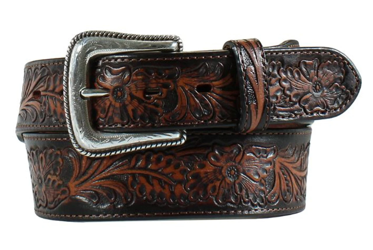 Quality menâs Nocona belt by M&F Western Products is made of genuine leather. The strap has an embossed floral design that runs the length of the belt.