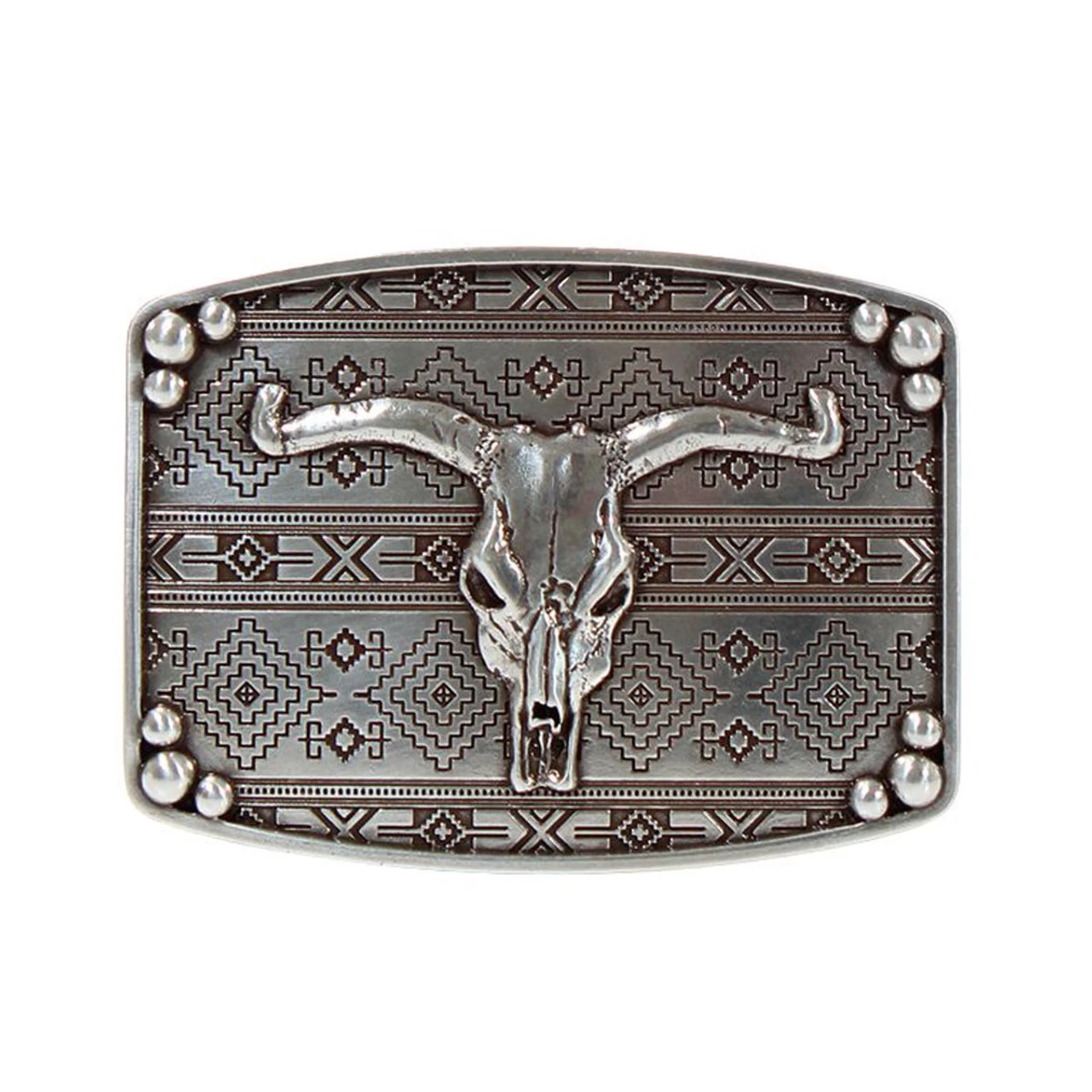This rectangle Nocona mens western buckle by M&F Western Products is definitely a head turner. There is an engraved pattern on the inlay of the buckle with a bull skull on top. 3 studs in each corner of the buckle to accent. Smooth edges. Nocona Mens Buckle Bull Skull Aztec Design Engraved Pattern on Inlay Smooth Edges Rectangle Measures: 2-1/2 x 3-1/2