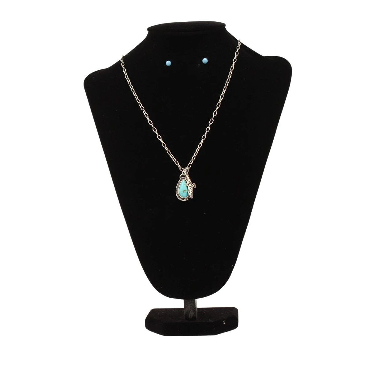 Fashionable Silver Strike necklace and earring set by M&F Western Products. Turquoise oval pendant and bird charm on silver tone chain. Matching stud earrings. Silver Strike Necklace and Earring Set Turquoise Oval Pendant Bird Charm Matching Earrings Measures: 18-1/2â to 23â