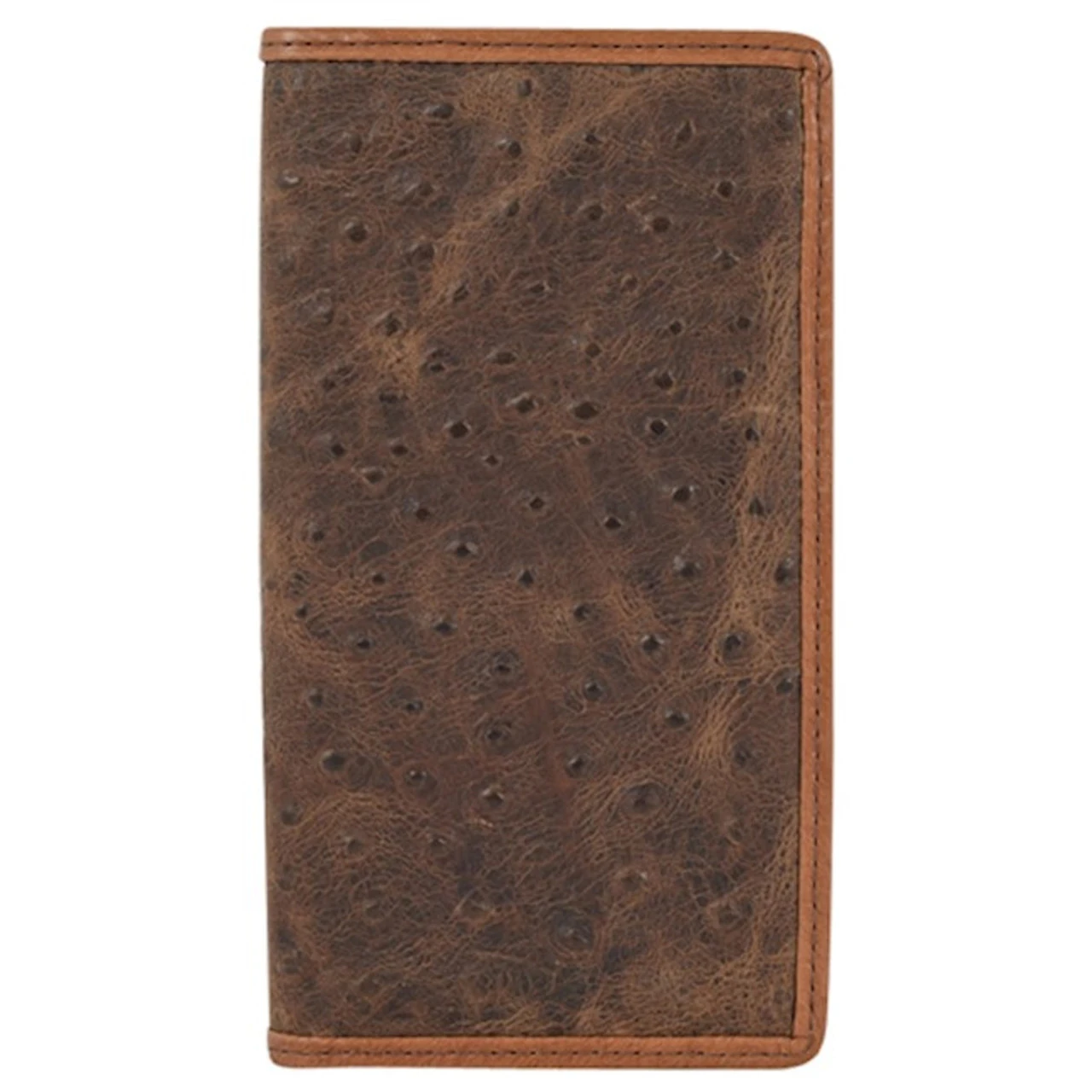 TONY LAMA RODEO WALLET, BROWN OSTRICH TEXTURED LEATHER W/CONTRASTING TRIM, 5 CREDIT CARD SLOTS, 1 ACCESSIBLE ID WINDOW, 3 SLIP POCKETS, 1 CHECKBOOK HOLDER, 1 EXTERIOR SLIP POCKET